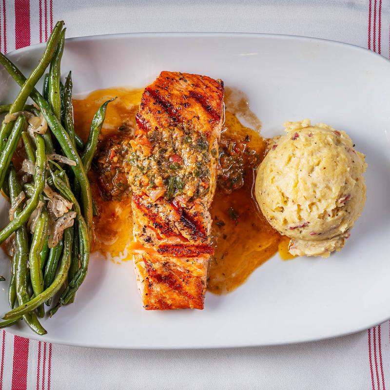 Served with roasted garlic mashed potatoes and fresh vegetable | Add a soup or salad +$6.00